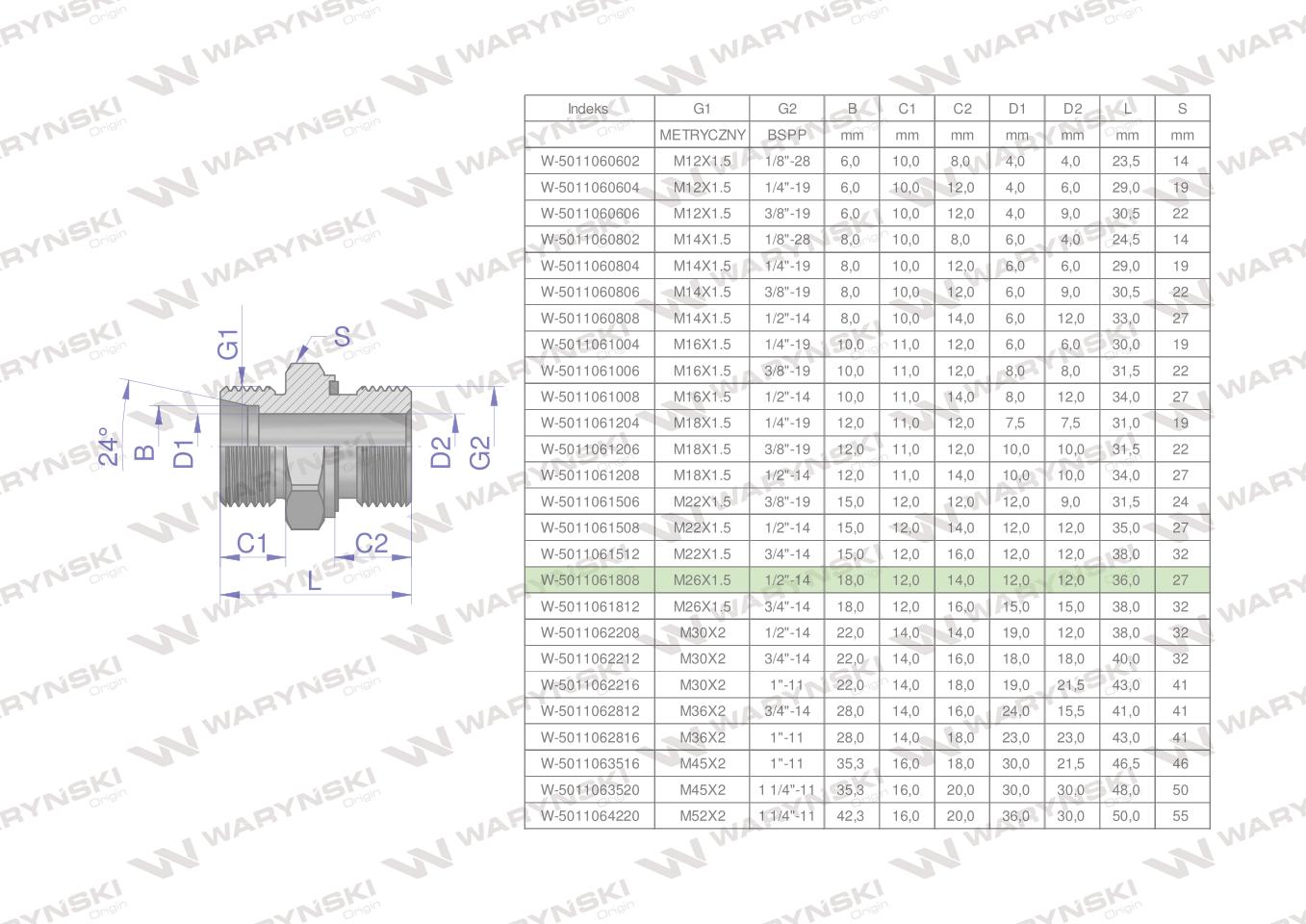 Hidraulički priključak (XGE) M26x1,5 18L x 1/2″ BSP ED Waryński (prodaje se u jedinicama od 2 kom.)