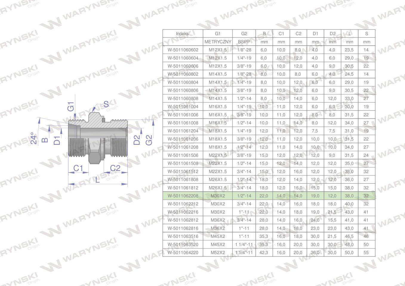 Hidraulički priključak (XGE) M30x2 22L x 1/2″ BSP ED Waryński (prodaje se u jedinicama od 2 kom.)