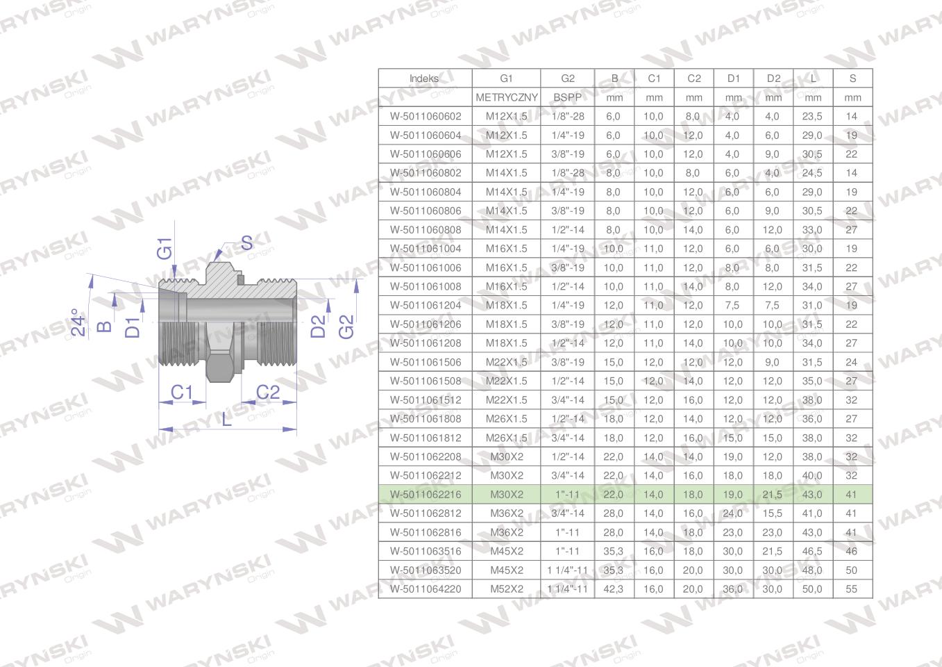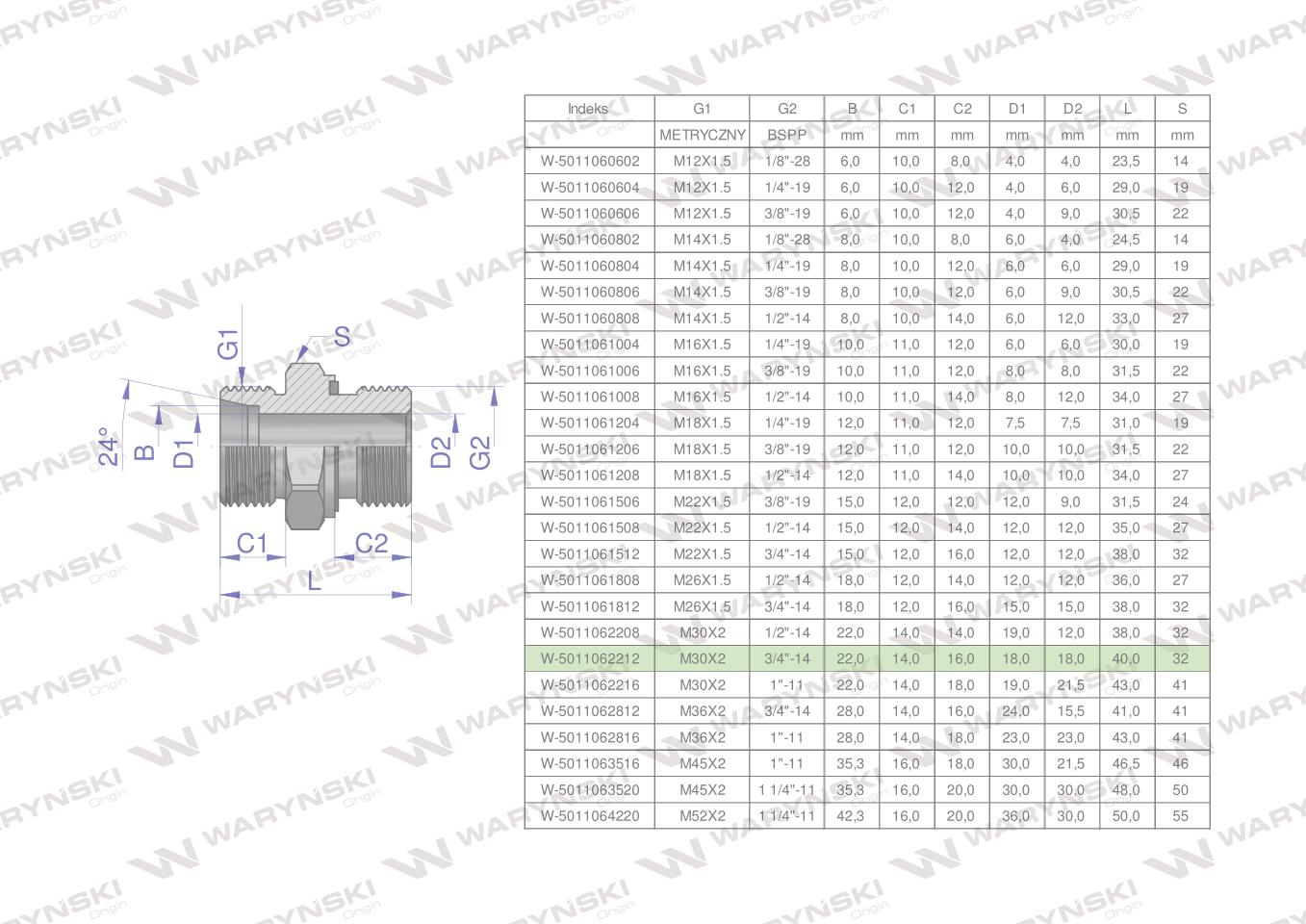 Hidraulički priključak (XGE) M30x2 22L x 3/4″ BSP ED Waryński (prodaje se u jedinicama od 2 kom.)