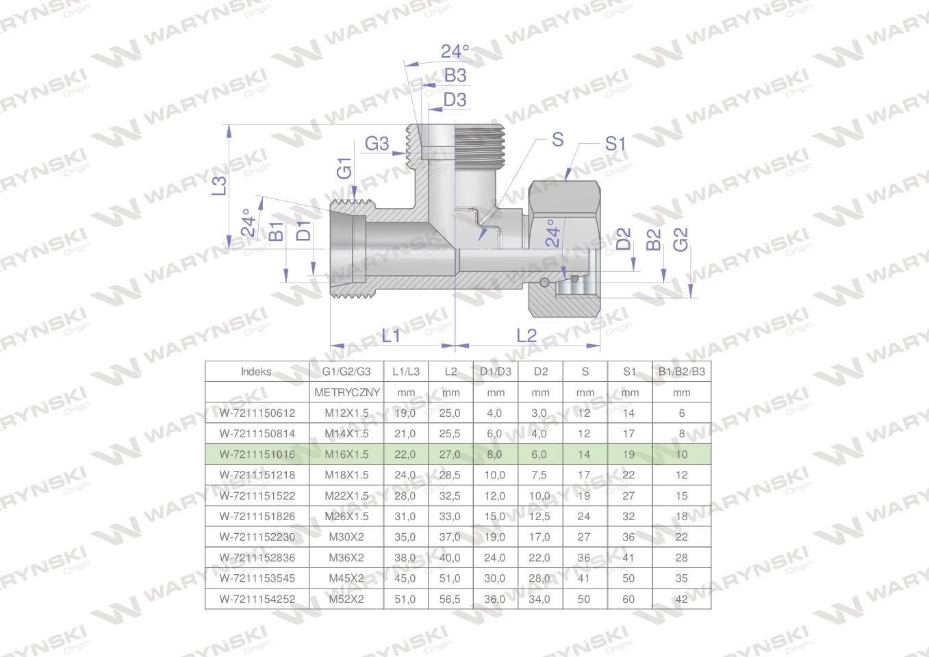T-komad hidrauličkog konektora, asimetrični, metrički BBA M16x1.5 10L (XEVL) Waryński (prodaje se u jedinicama od 2 kom.)