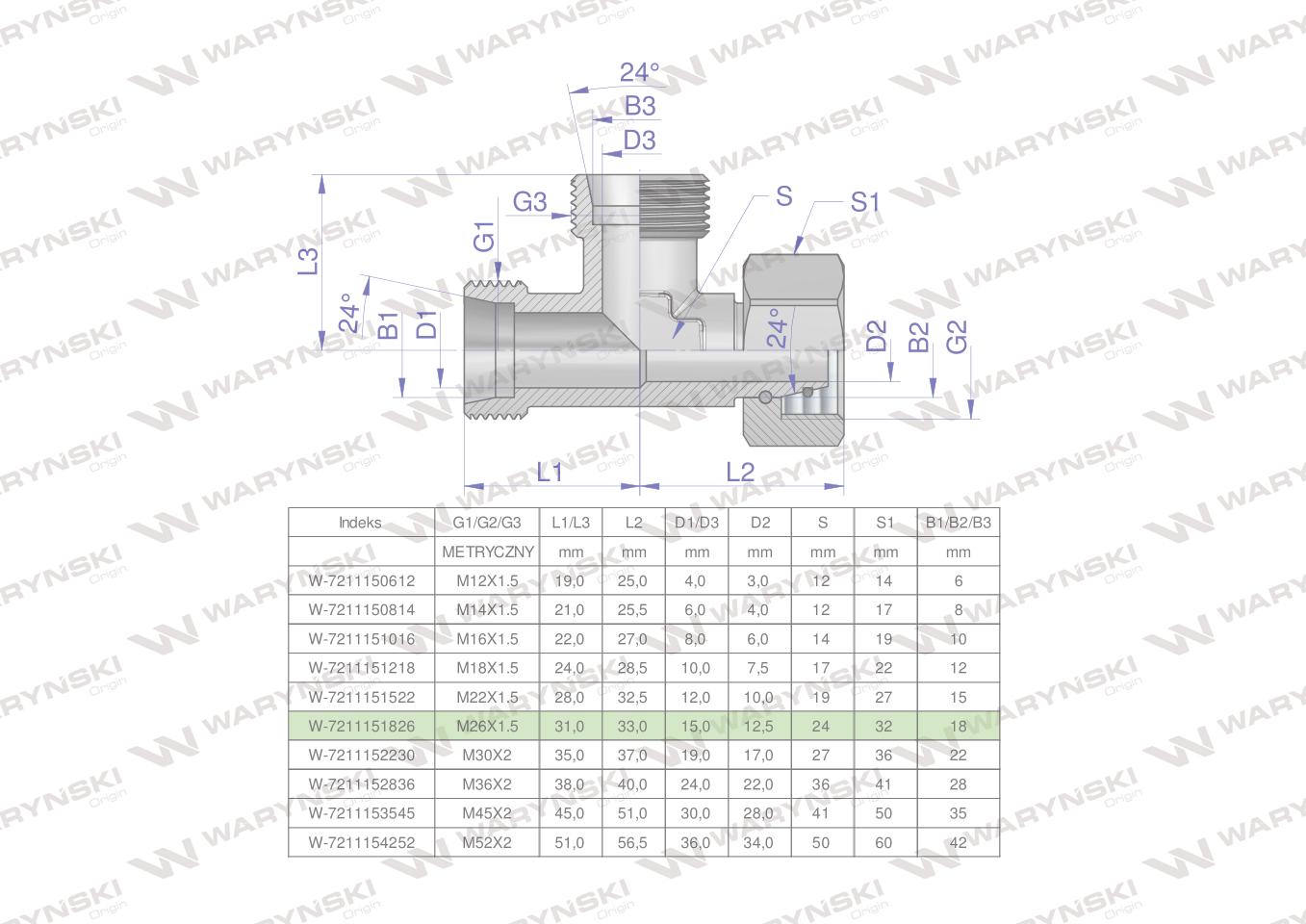 T-komad hidrauličkog konektora, asimetrični, metrički BBA M26x1.5 18L (XEVL) Waryński
