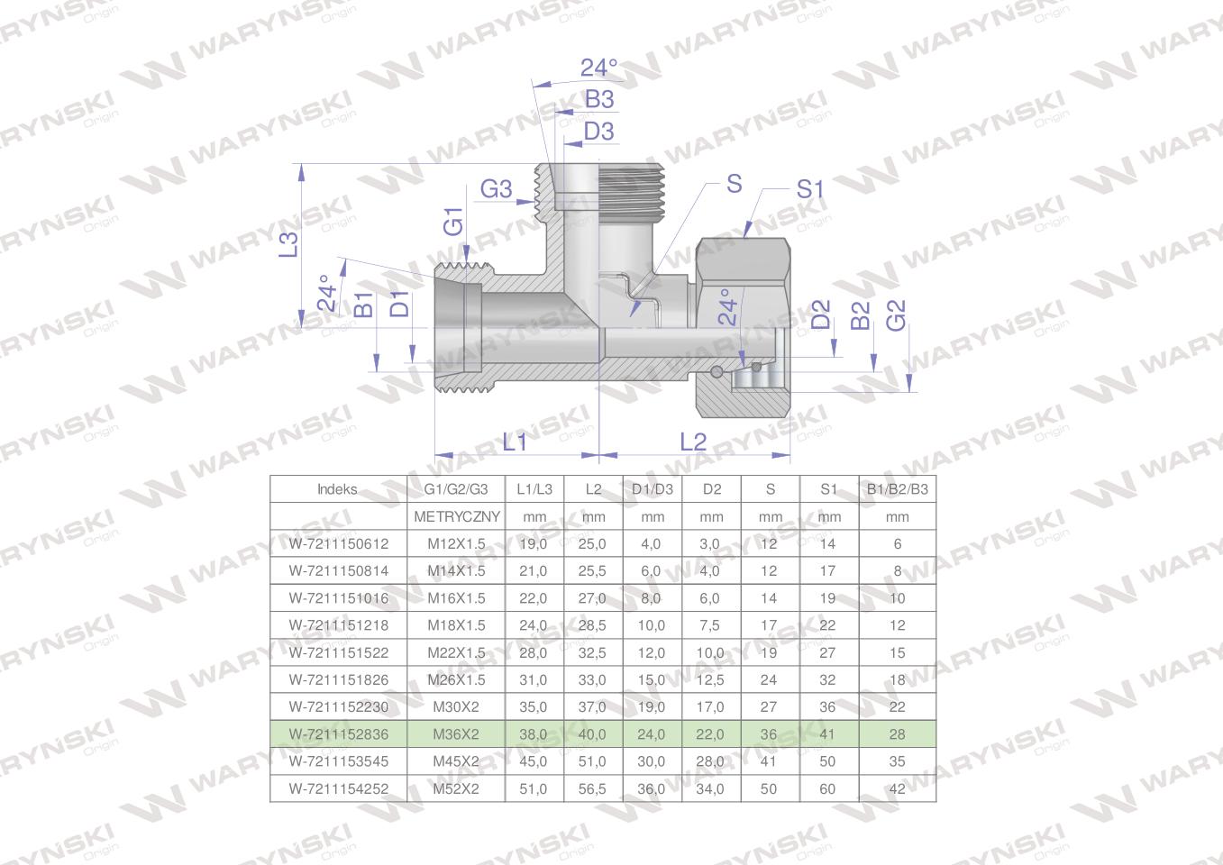 T-komad hidrauličkog konektora, asimetrični, metrički BBA M36x2 28L (XEVL) Waryński