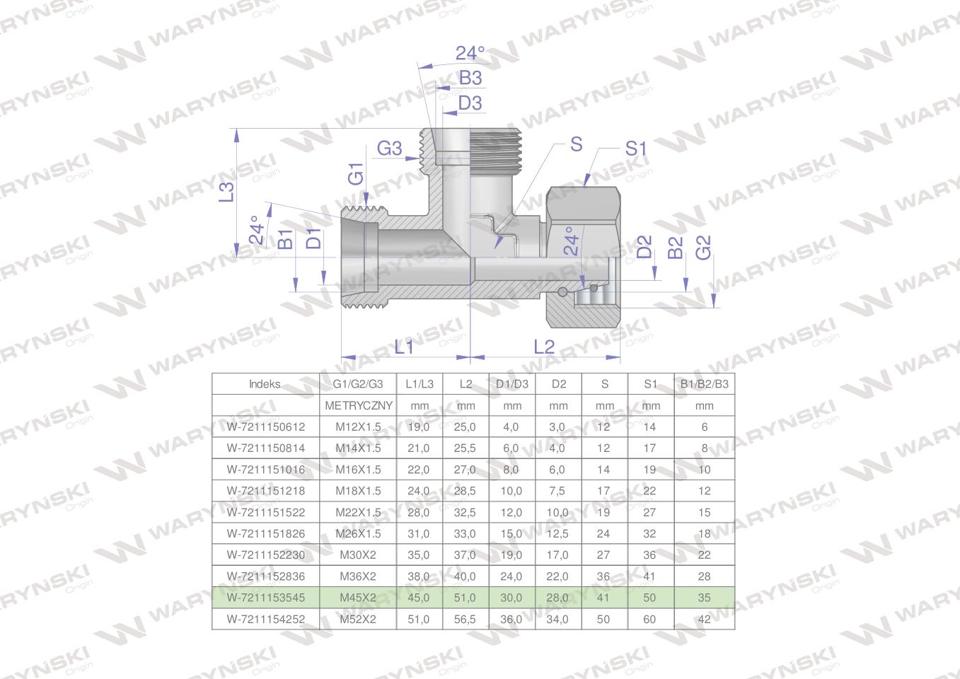 T-komad hidrauličkog konektora, asimetrični, metrički BBA M45x3 35L (XEVL) Waryński