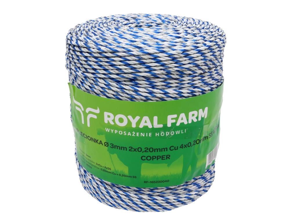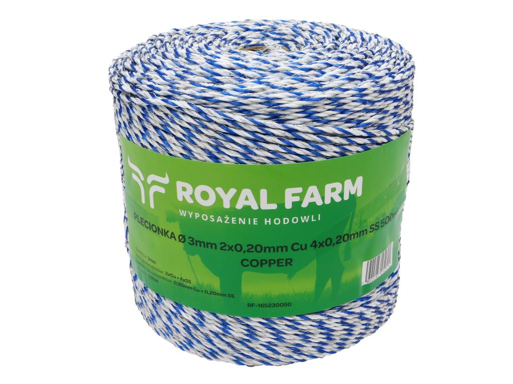 Plecionka, do elektryzatora 3mm, 2×0,20mm Cu, 4×0,20mm SS biało-niebieska 500m, Royal Farm
