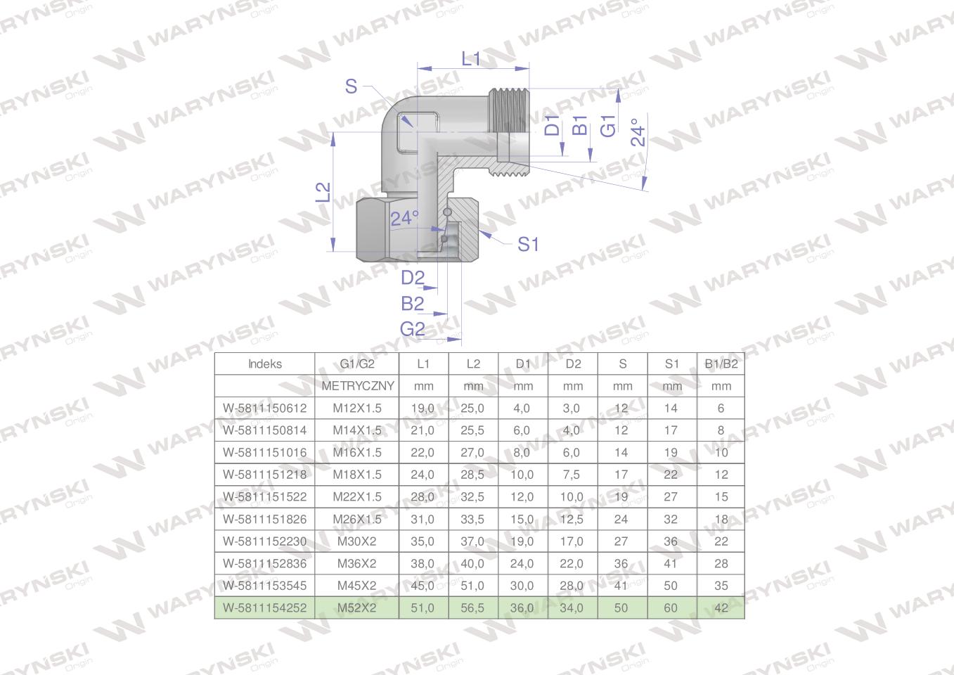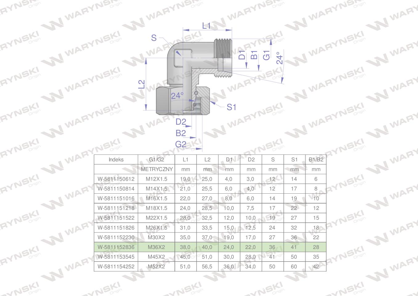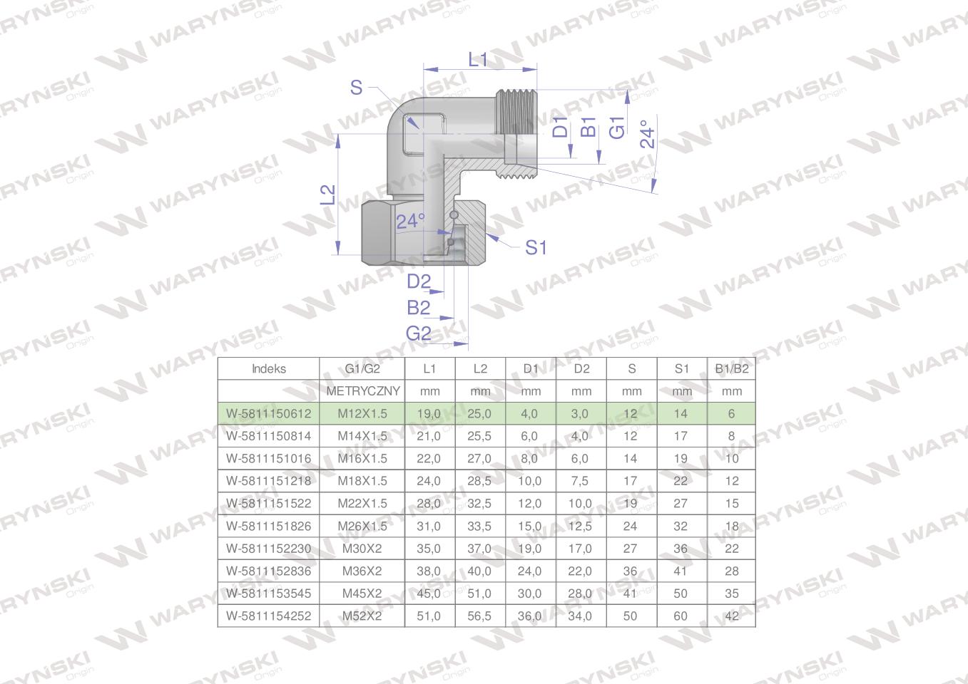 Hidraulični koljeni spoj, metrički AB M12x1.5 06L (XEVW) Waryński (prodaje se u jedinicama od 2 kom.)