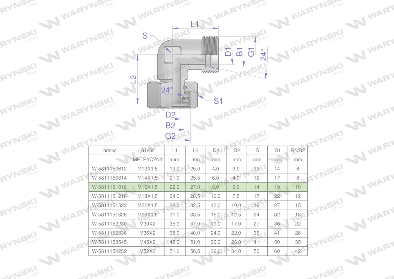 Hidraulični koljeni spoj, Metrički AB M16x1.5 10L (XEVW) Waryński (prodaje se u jedinicama od 5 kom.)