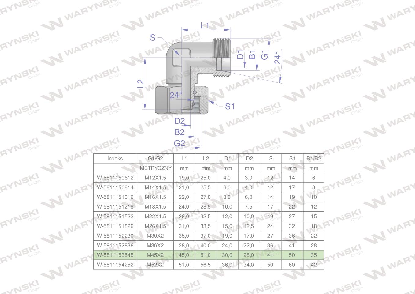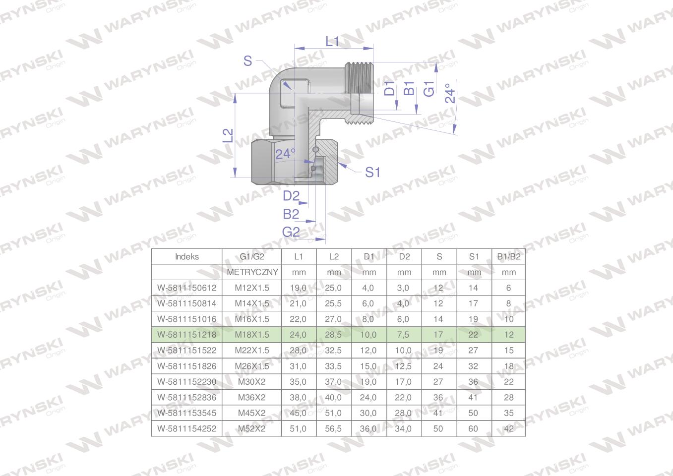 Hidraulični koljeni spoj, Metrički AB M18x1.5 12L (XEVW) Waryński (prodaje se u jedinicama od 5 kom.)