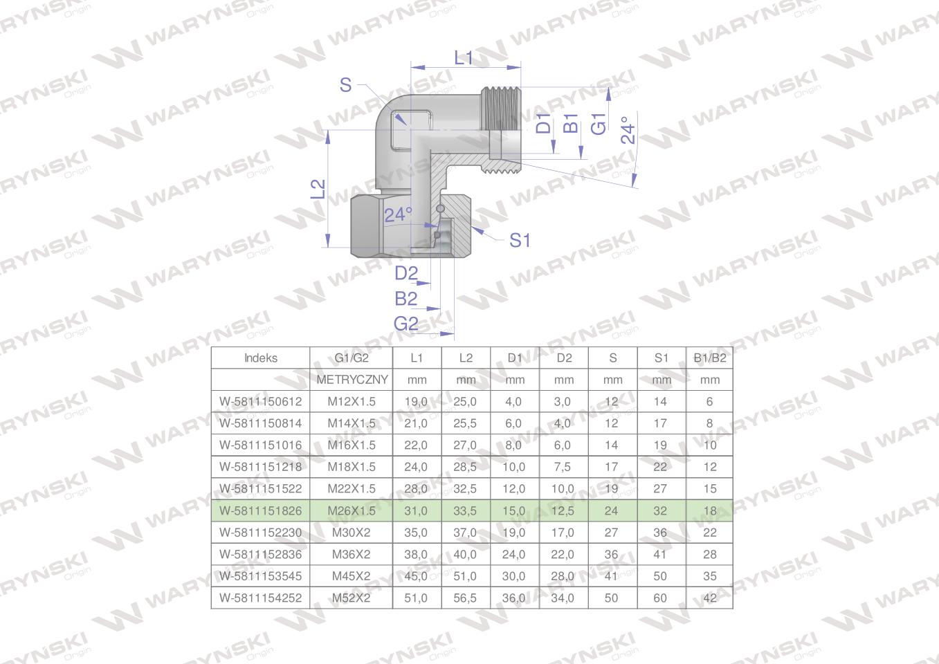 Hidraulični koljeni spoj, metrički AB M26x1.5 18L (XEVW) Waryński