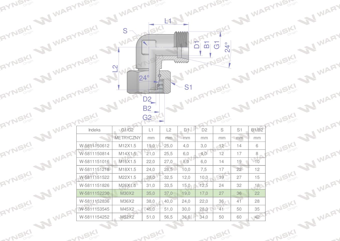Hidraulični koljeni spoj, metrički AB M30x2 22L (XEVW) Waryński